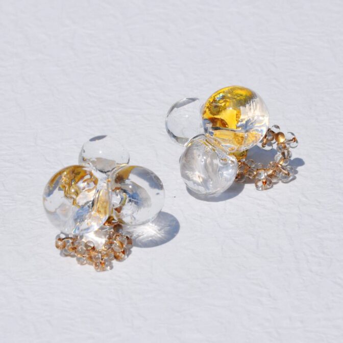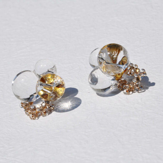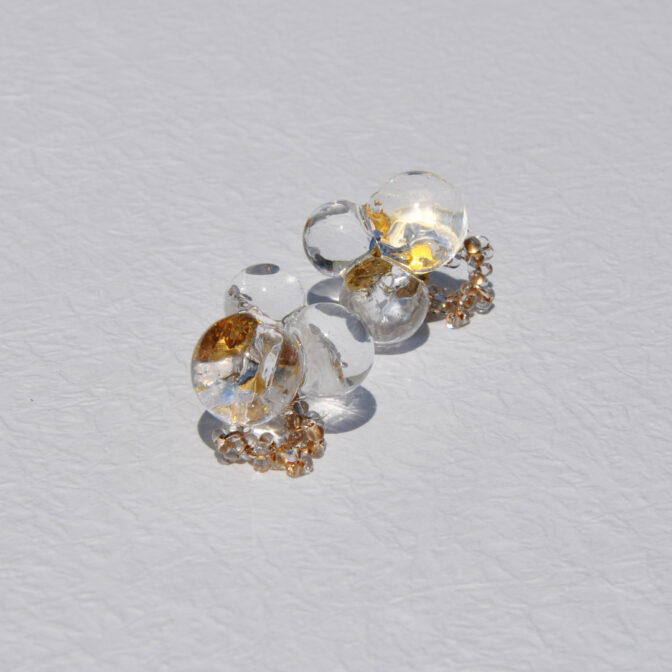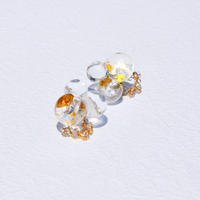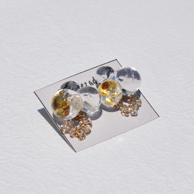 手作りの玉に穴をあけ、シャワー台に縫い付けた後さらにレジンでコーティング
