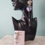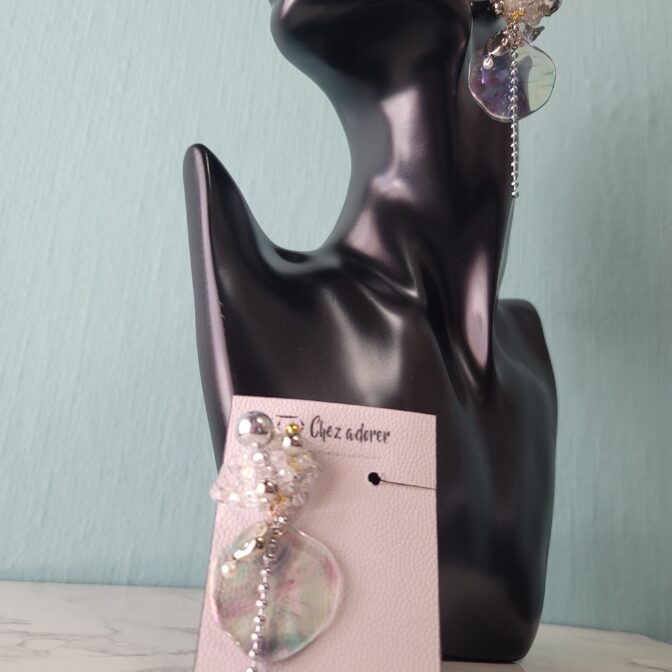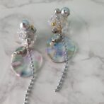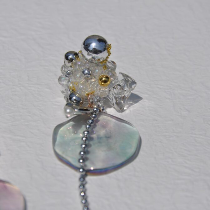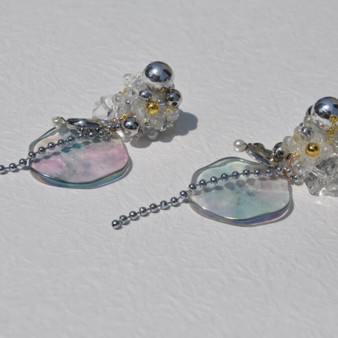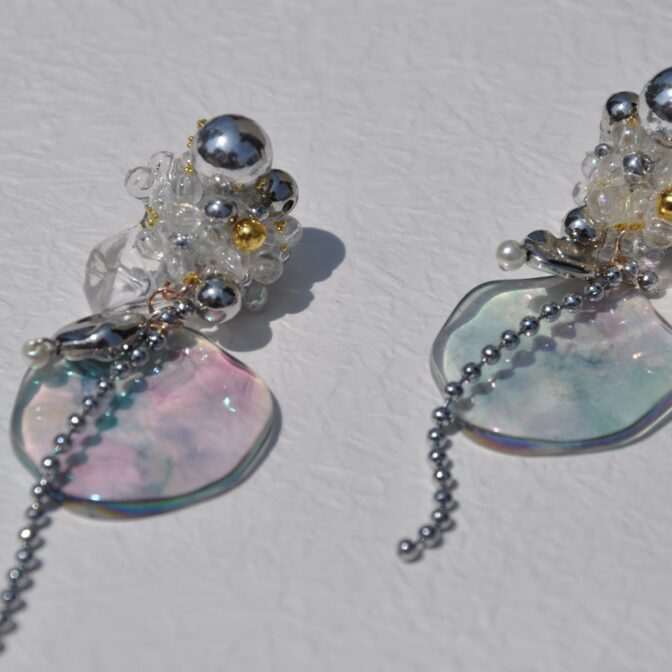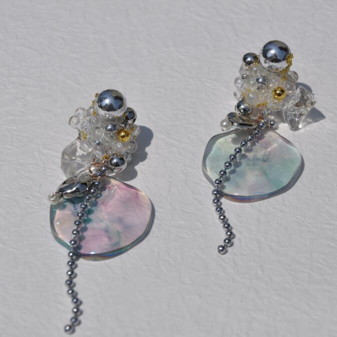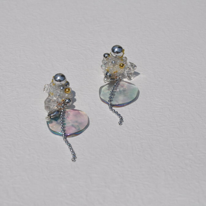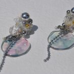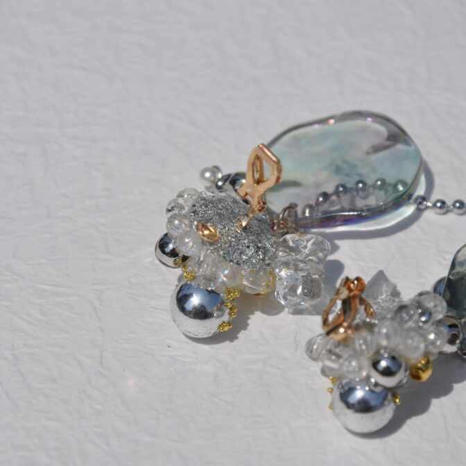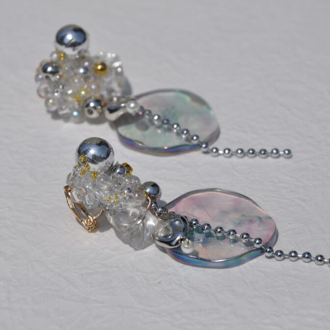 を刺繍し、シャボン玉のような水面のような風合いの波パーツにシルバーの変形パーツとパール・ボールチェーンで仕上げたイヤリングです