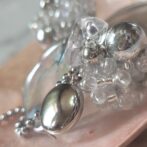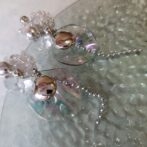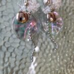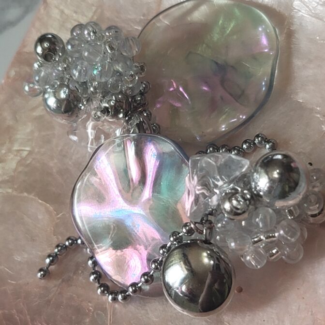 氷パーツ、クリアビーズ、シルバービーズ、オーロラビーズを刺繍し、シャボン玉のような水面のような風合いの波パーツにシルバーのラウンドパーツとボールチェーンで仕上げたピアスです。