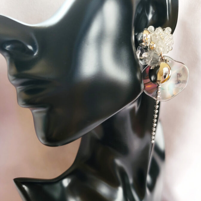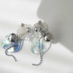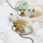 氷パーツ、クリアビーズ、シルバービーズ、オーロラビーズを刺繍し、シャボン玉のような水面のような風合いの波パーツにシルバーのラウンドパーツとボールチェーンで仕上げたイヤリングです。