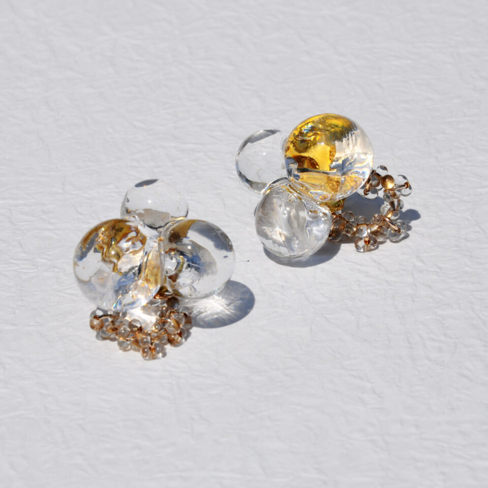 手作りの玉に穴をあけ、シャワー台に縫い付けた後さらにレジンでコーティング みずみずしさがでるようにレジンをたらして ファルファーレビーズをたらしてしあげました♪ ポスト、キャッチ部分にはアレルギーのでにくい素材、サージカ […]